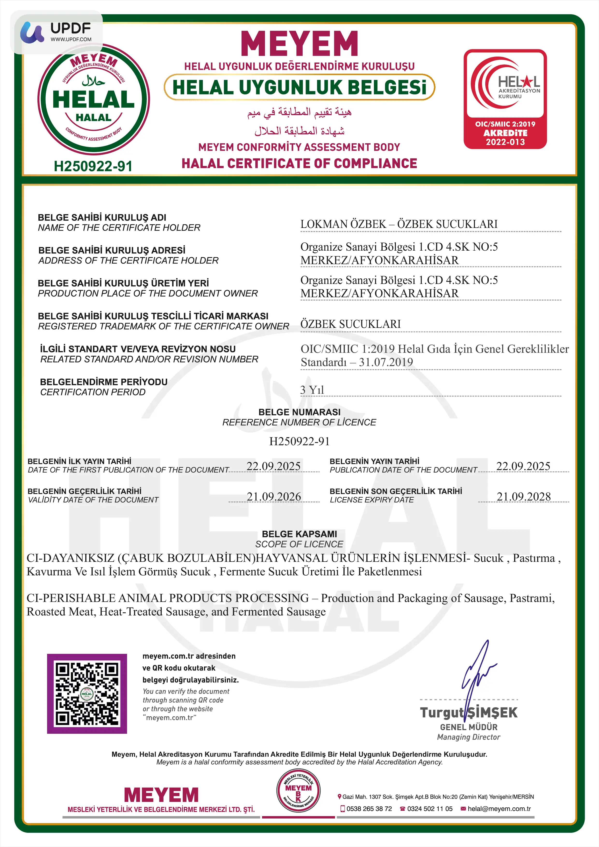 Ürünlerin helal uygunluk kriterlerine göre üretildiğini ve proseslerin denetlendiğini belgeleyen sertifika.